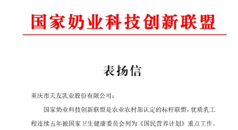 天友乳業、華山牧乳業喜獲國家奶業科技創新聯盟官方表揚信
