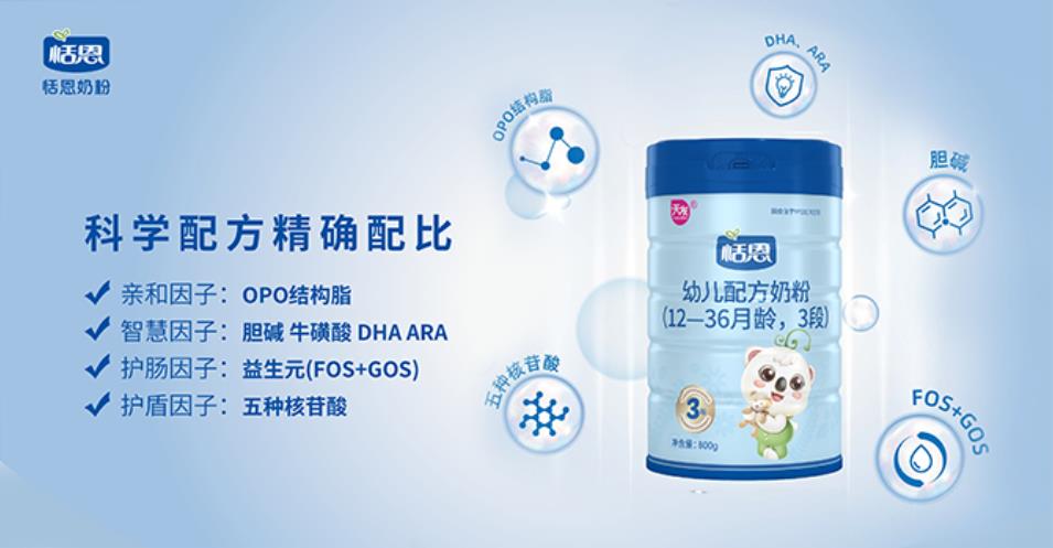 恬恩奶粉的配方由重慶市乳制品工程技術研發中心研發,總結亞洲人群母乳精華,匠心打造第三代OPO配方,更貼近中國母乳結構,更適合中國寶寶體